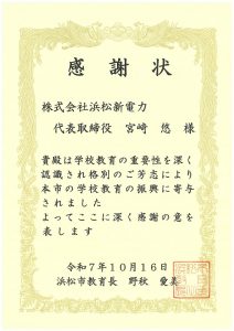 寄附に伴い、浜松市教育委員会より感謝状を受領しましたので、お知らせいたします。