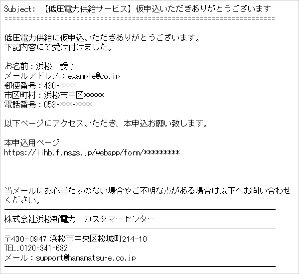 1提供エリアと各種同意 1-1はじめに 1-2提供エリアの確認 1-3各種同意確認 2仮申し込み 2-1仮申込フォームの入力 2-2入力内容の確認 2-3確認メールが届きます 3本申し込み 3-1認証 3-2申込メニューの選択 3-3検針票または請求書をご用意ください。 3-4供給地点特定番号を入力 3-5契約番号・お客さま番号を入力 3-6お客さま情報の入力 3-7検針票または請求書のファイルを添付 3-8入力内容の確認 3-9確認メールが届きます 3-10ポータルのご利用案内が届きます 4クレジットカード情報~手続き完了まで 4-1クレジットカード情報を登録 4-2クレジットカード情報を入力 4-3手続き完了 1提供エリアと各種同意 1-1はじめに パソコン・スマートフォンからお申込いただけます。お申込の際はお手元に「検針票または請求書」と「クレジットカード」をご用意ください。 1-2提供エリアの確認 郵便番号を入力してください。※浜松市内の方のみ申込可能です。 1-3各種同意確認 提供エリアと判定されましたら、各種同意確認をお読みいただき、チェックをつけてください。 2仮申し込み 2-1仮申込フォームの入力 お名前、メールアドレス、郵便番号、電話番号を入力ください。郵便番号を入力すると自動で市町村まで入りますので、番地や建物名など追加で入力お願いいたします。 2-2入力内容の確認 確認画面にてお申込内容をご確認ください。 2-3確認メールが届きます 入力いただいたアドレス宛てに確認メールが届きます。本申込用ページのURLが記載されていますので、そちらからアクセスしてください。 3本申し込み 3-1認証 仮申込で登録した「メールアドレス」「電話番号」と仮申し込み受付メールに記載されている「認証用パスワード」を入力して認証を進めてください。 ※仮申込から72時間がお手続きの有効期限です※本申込みの受付が既に完了している場合は認証エラーとなります 3-2申込メニューの選択 申込メニューを選んでください。料金プランについての詳細はリンクより確認いただけます。 料金メニューはこちら 3-3検針票または請求書をご用意ください。 検針票または請求書に記載の契約容量を入力します。 3-4供給地点特定番号を入力 検針票または請求書に記載の供給地点特定番号を入力します。 3-5契約番号・お客さま番号を入力 現在の電気事業者の契約番号・お客さま番号を入力します。「説明を見る」で詳しい解説が開きます。 3-6お客さま情報の入力 必要事項を入力ください。お名前、フリガナ、アドレスは仮申込時に入力いただいた内容が反映されます。 3-7検針票または請求書のファイルを添付 「ファイルを選択」し、カメラで撮影した検針票または請求書のファイルを添付してください。※5MB以内 3-8入力内容の確認 確認画面にてお申込内容をご確認ください。 3-9確認メールが届きます 入力いただいたアドレス宛てに確認メールが届きます。 3-10ポータルのご利用案内が届きます マイページのログイン情報が届きます。 4クレジットカード情報~手続き完了まで 4-1クレジットカード情報を登録 クレジットカード登録ページのログイン情報が届きます。 4-2クレジットカード情報を入力 クレジットカード情報をご入力ください。 4-3手続き完了 確認画面にて内容をご確認ください。以上で手続きは完了です。